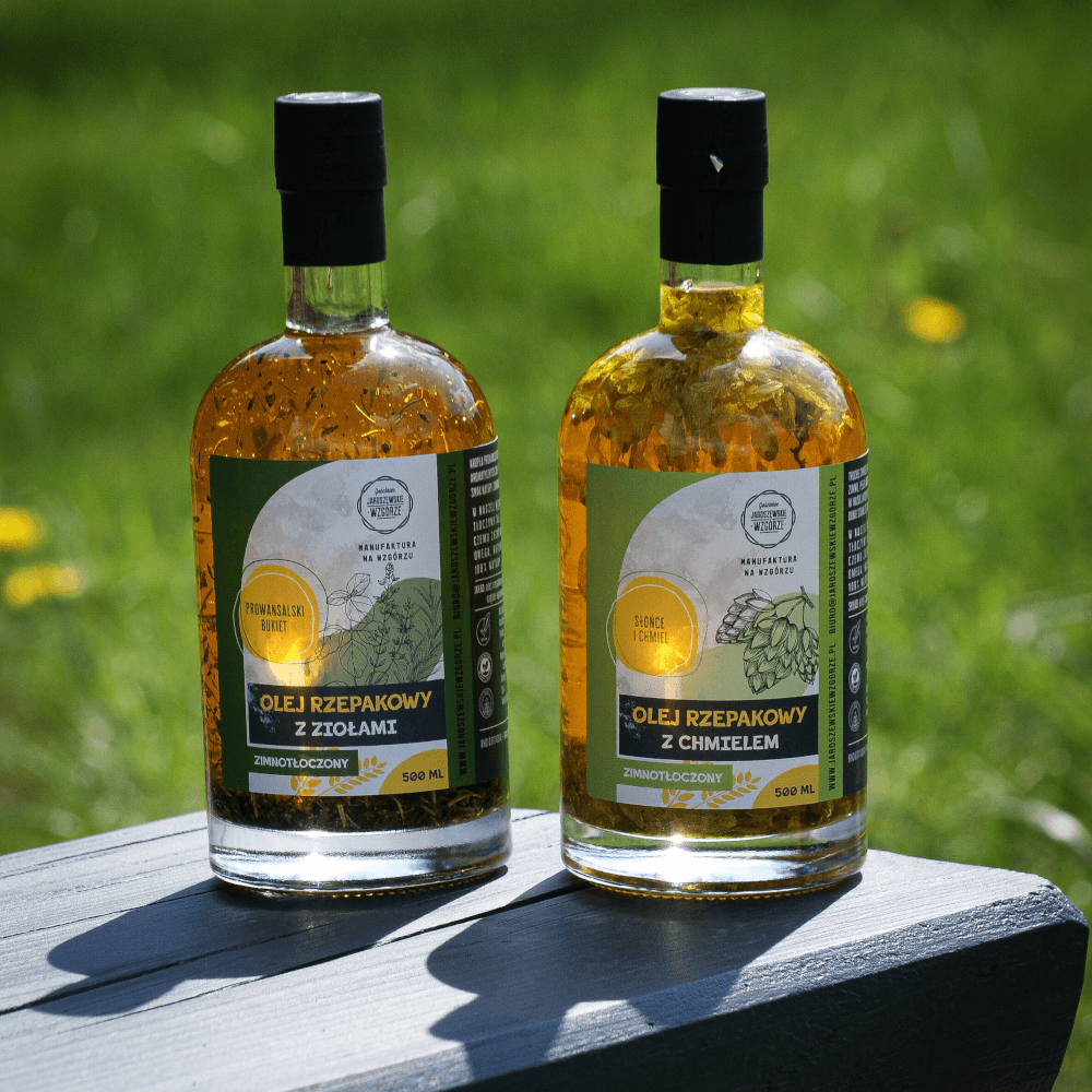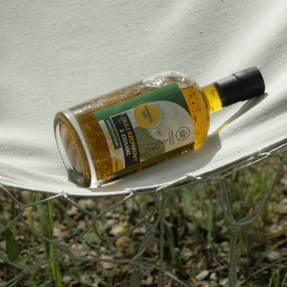 Kropla Prowansji na Twoim talerzu! Tłoczony na zimno olej rzepakowy wzbogacony mieszanką aromatycznych ziół – tymianku, rozmarynu i bazylii. Idealny do sałatek, pieczywa i ciepłych dań. smak natury, zamknięty w butelce!